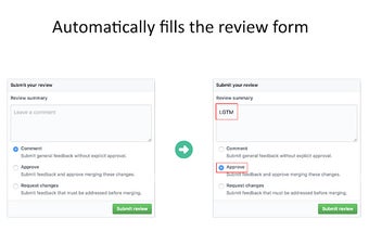 LGTM는 Github 사용자들의 생산성을 향상시키고, 주로 반복적인 작업으로 인한 수근관 증후군을 예방하기 위해 wateret이 개발한 유용한 크롬 확장 프로그램입니다. 이 확장 프로그램은 풀 리퀘스트에서 "Review Changes" 버튼 옆에 편리한 "LGTM" 버튼을 추가합니다. 클릭하면 버튼은 자동으로 기본 리뷰 코멘트를 채우고 "Approve" 라디오 버튼을 선택합니다.